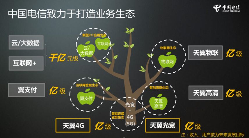 中国电信:实施转型3.0,布局业务生态化。 第八届智能终端及移动互联网产业高峰论坛上,中国电信董事长杨杰表示:中国电信将围绕云、大数据、互联网+、翼支付、天翼4G、天翼光宽、天翼物联、天翼高清,打造业务生态。2020年末移动、宽带、固话、天翼高清、物联网等主要业务用户合计规模可达8亿,非连接型业务收入占比超过25%。