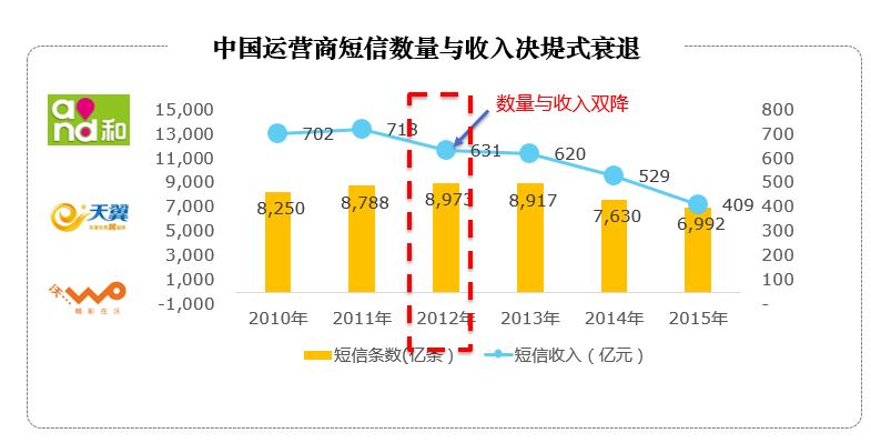 作为2G时代“杀手级”应用的短信却是一场空前的灾难。全行业短信收入从2011年的718亿,下降到2015年的409亿,损失超过300亿,仅短信一项收入相当于影响行业收入3PP。数百亿的业务单元即将被互联网吞噬殆尽!