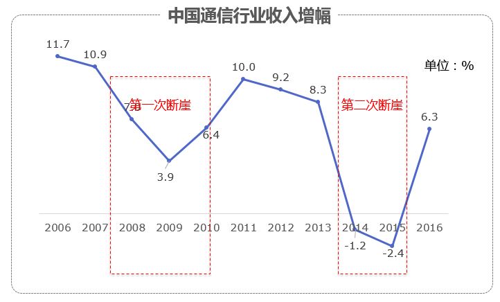 行业回暖,通信业是柳暗花明,还是回光返照?经历了连续两年的负增长之后,2016年通信业终于走出衰退的阴霾。工信部公布数据显示,2016年全行业收入增幅已经突破6%。但是,回首中国通信业过去的十年,我们经历了两次断崖式的挫折。第一次断崖发生在2009年,中国通信业从此结束了长达十多年的两位数增长,跌落到3.9%,全行业震惊;时隔五年之后,2014年第二次断崖又出现了,全行业连续两年负增长,衰退的阴云开始笼罩,今人绝望!2016年,行业回暖,这到底是柳暗花明,还是回光返照?通信业跌宕起伏是必然还是偶然呢?