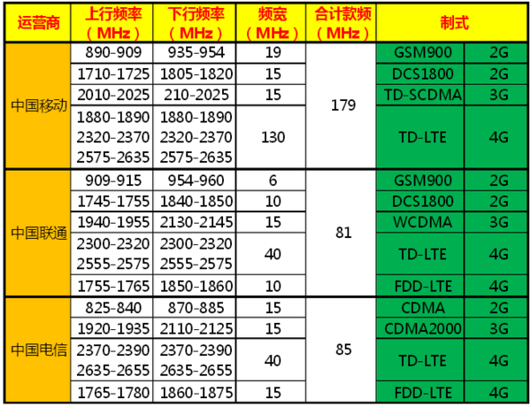 移动的GSM(2G),TDS(3G),TDD-LTE,以及FDD-LTE(4G)。